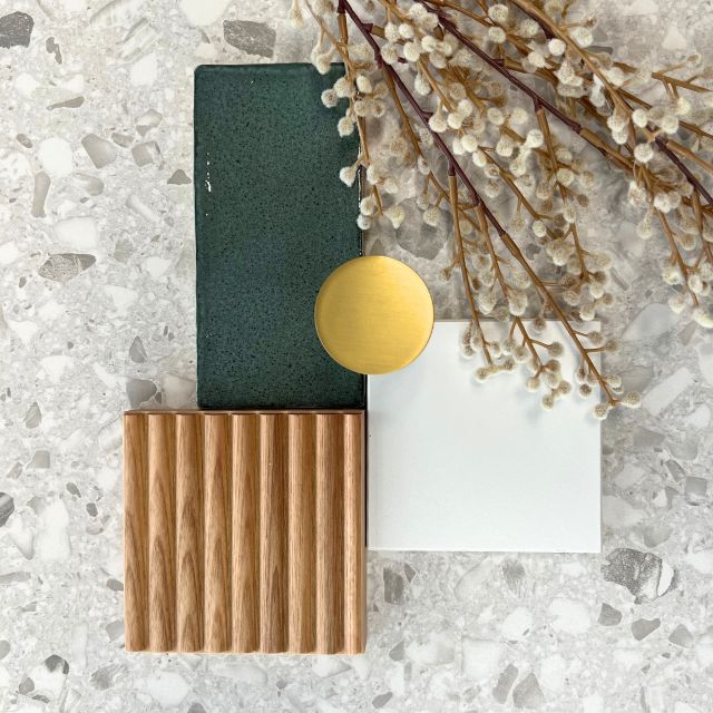 Select the Fluted Ash cabinet finish and Pure White benchtop options then you have the option to further select up to 3 tapware swatches and 5 tile options. We have included a selection of our most popular floor and wall tiles.