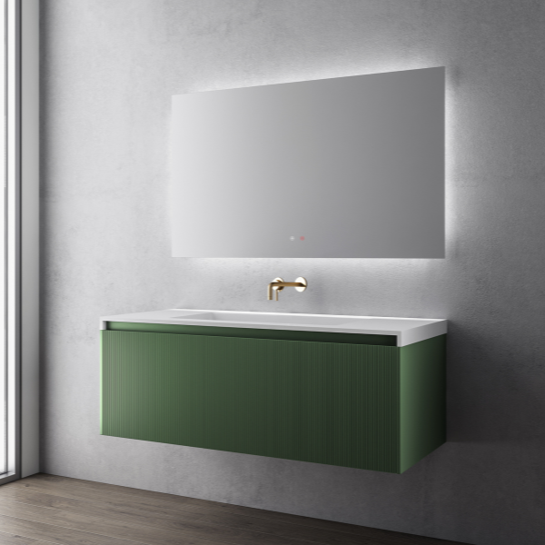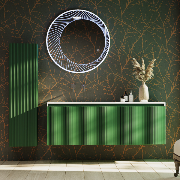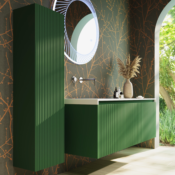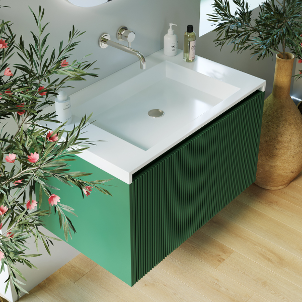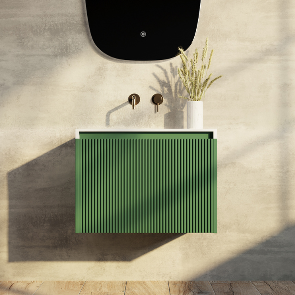 Rimini Vanity in Rainforest Green is a harmonious blend of elegance and functionality. Its unique fluted design adds texture and character to your bathroom's style, while the biophilic Rainforest Green colour exudes an organic and natural charm. Embracing the essence of tranquility, the Rimini vanity beckons with its soothing rainforest allure. Enveloping your space in a sense of serenity, it invites you to step into a world where relaxation and luxury intertwine effortlessly. Functionality reigns supreme with abundant storage. Clean lines and a luxurious matte white integrated basin top complete with a matching solid surface pop-up waste.