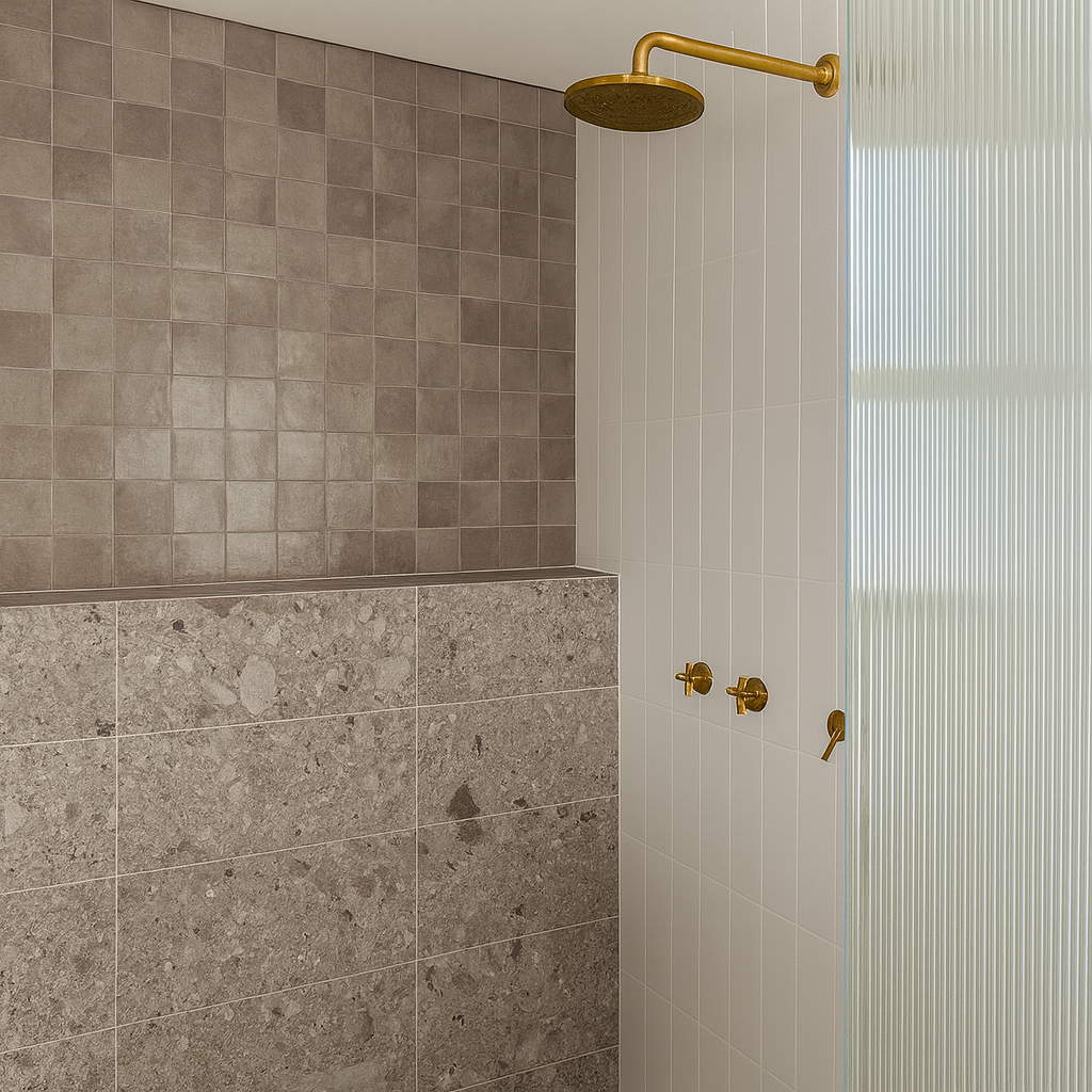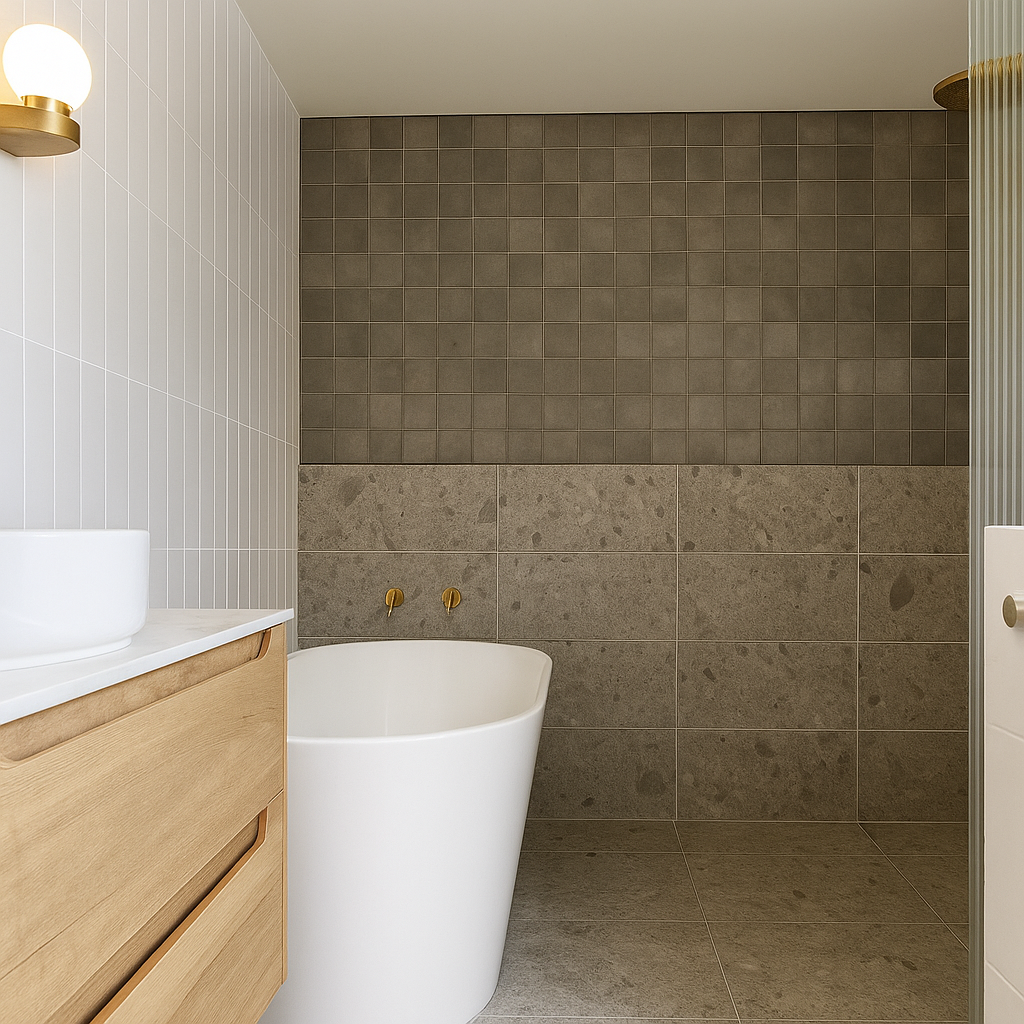 Pictured: Taupe Ellas installed and grouted with Light Grey grout
