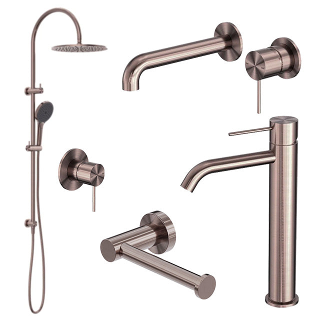 Brushed Bronze Mecca Bathroom Tapware Package, containing a Tall basin mixer, bath mixer, shower mixer, shower and toilet roll holder.