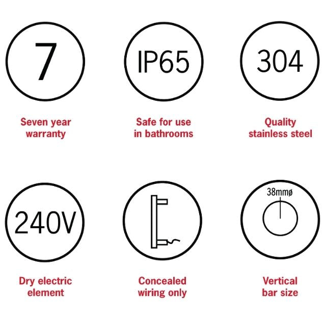 • As with most Thermorail Heated Towel Rails, the Vertical Rails heat to around 35 degrees. When a towel is placed over the bars the towel insulates the rail and absorbs the heat, meaning that beneath the towel the temperature will rise to between 50 – 55 degrees.