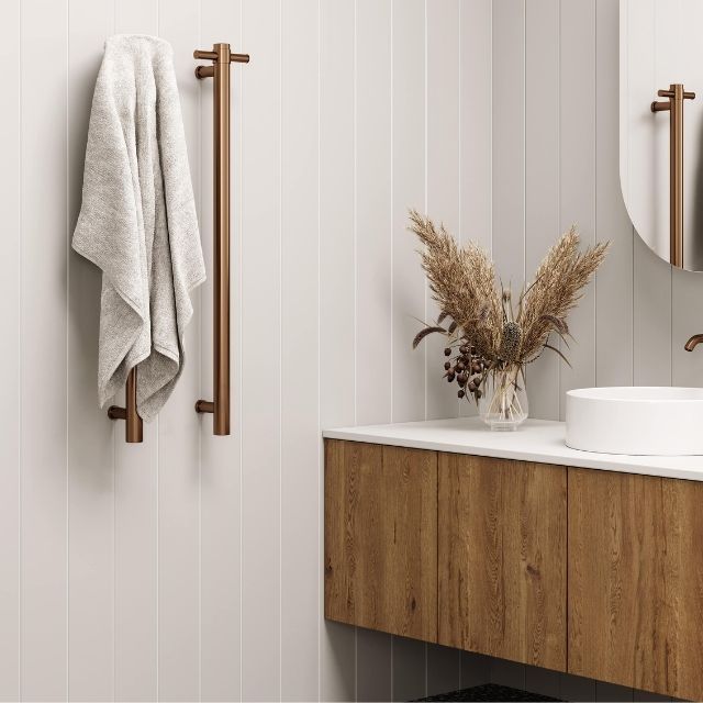 Introducing the Thermogroup Thermorail 240 Volt Single Heated Towel Rail in Brushed Bronze. Enjoy warm and cozy towels every day with our high-quality heated towel rail. Made with durable materials and featuring a stylish brushed bronze finish, this towel rail not only adds a touch of luxury to your bathroom, but also provides the practical benefit of keeping your towels warm and dry.