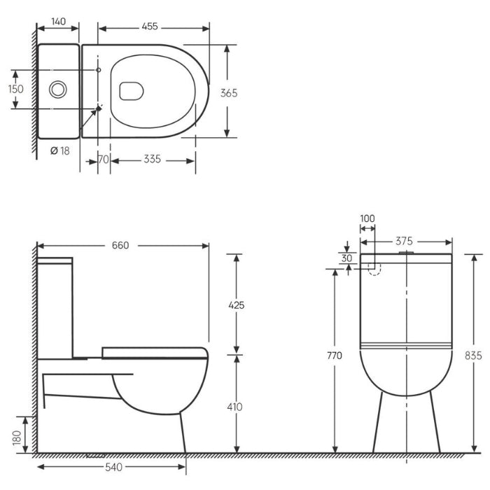 - Traditional looking back-to-wall, close-coupled, rimless toilet suite