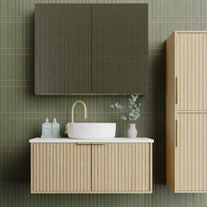 Our japandi vanities feature integrated stone basins and soft-close drawers. Wall-mounted options free up floor space, while freestanding designs add sculptural interest. Pair them with our minimalist taps for a unified look.