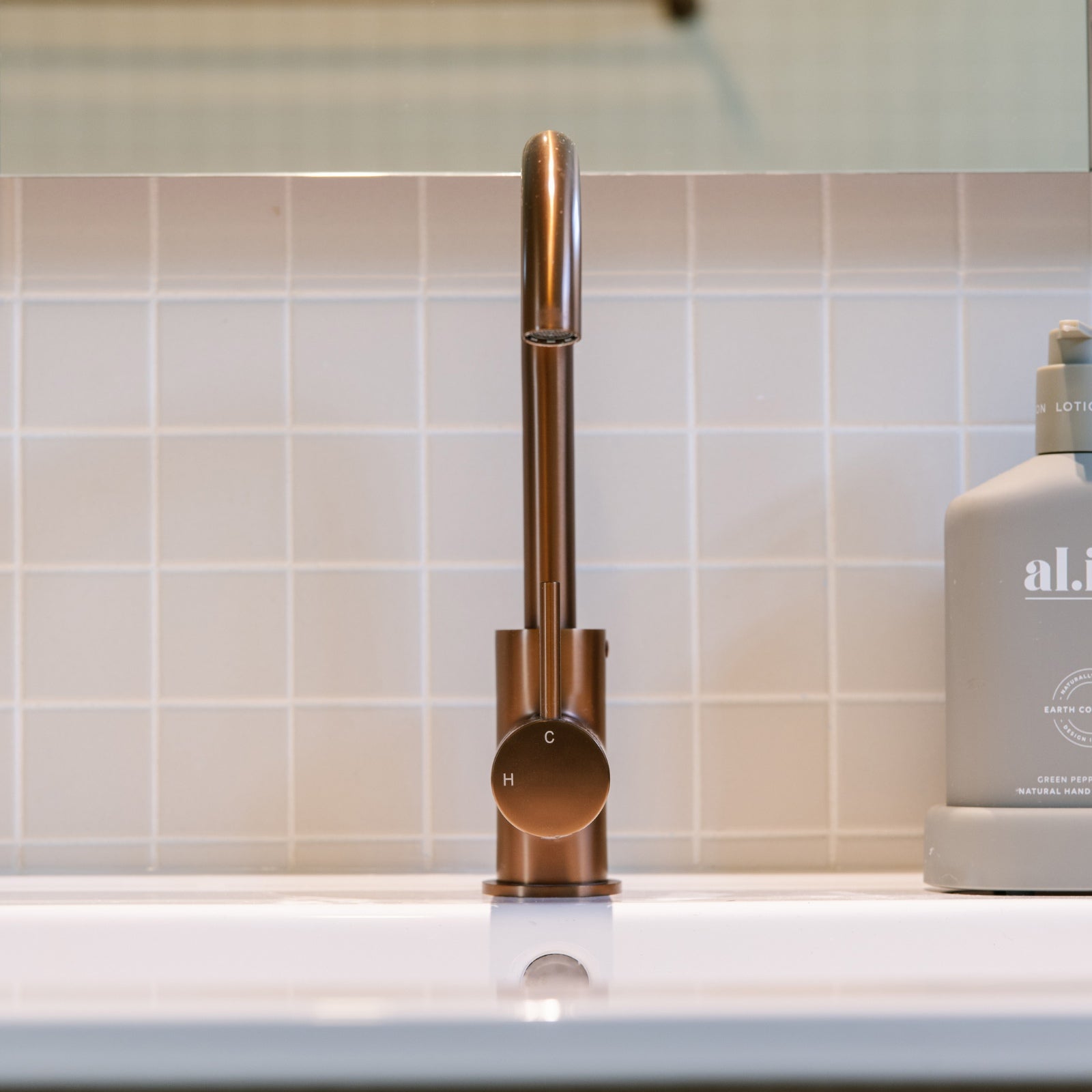 Meir Round Gooseneck Basin Mixer with Cold Start Lustre Bronze