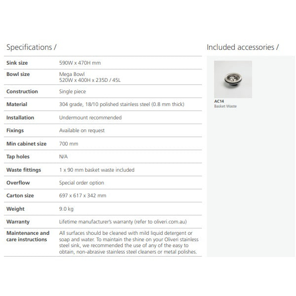 Oliveri Laundry 45L undermount tub NTH