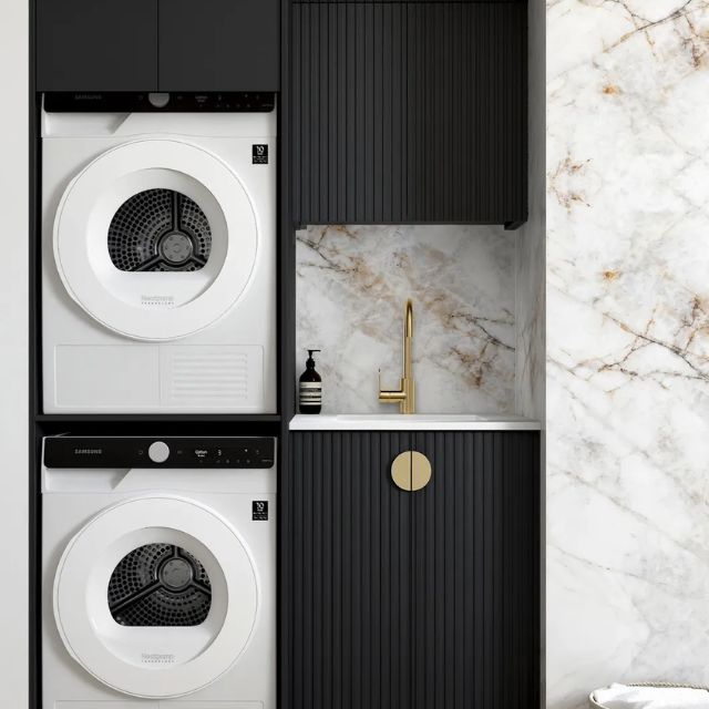 Introducing the Otti Marlo 1305mm Fluted Laundry Set C - Black. This premium laundry set features a sleek and sophisticated design with a tall washing machine cabinet, providing both style and functionality. Elevate your laundry room with this exclusive and elegant addition.