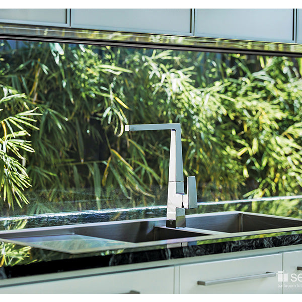 The tapering design of the Skala kitchen mixer has iconic presence. The edges and corners are softened, giving the minimalist square design a softer, refined quality