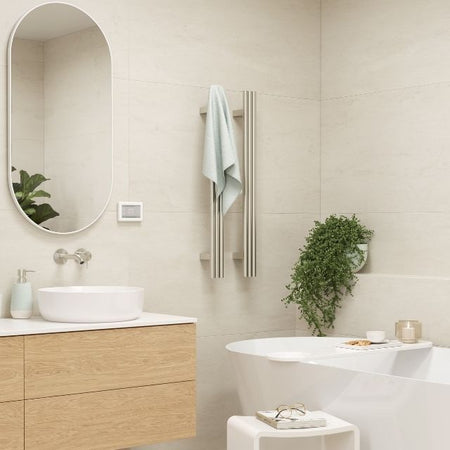 The Thermorail Pill Vertical Heated Towel Rails are designed to help dry your towel and create a design statement in your bathroom particularly in bathrooms with limited wall space. The pill shape helps to add a gentle soft feel to the room and compliments your design. It is recommend to use one bar per towel to ensure enough contact between the rail and the towel for effective drying. The towel drapes over the top of the rail and covers the heated bar, allowing the heat to pass through and dry the towel.