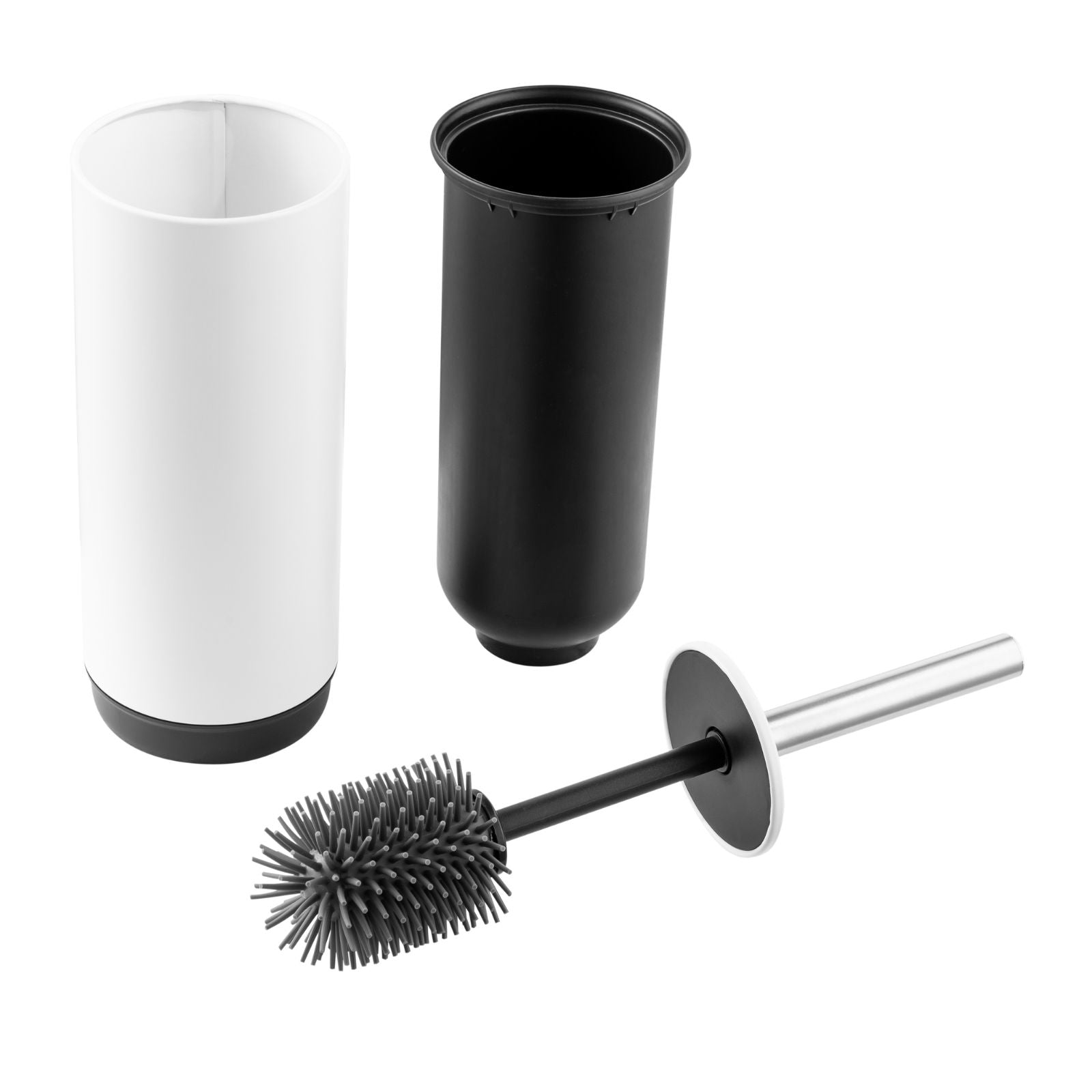 1 x Toilet brush holder, 1 x inner compartment, 1 x chrome handle, 1 x silicone brush head