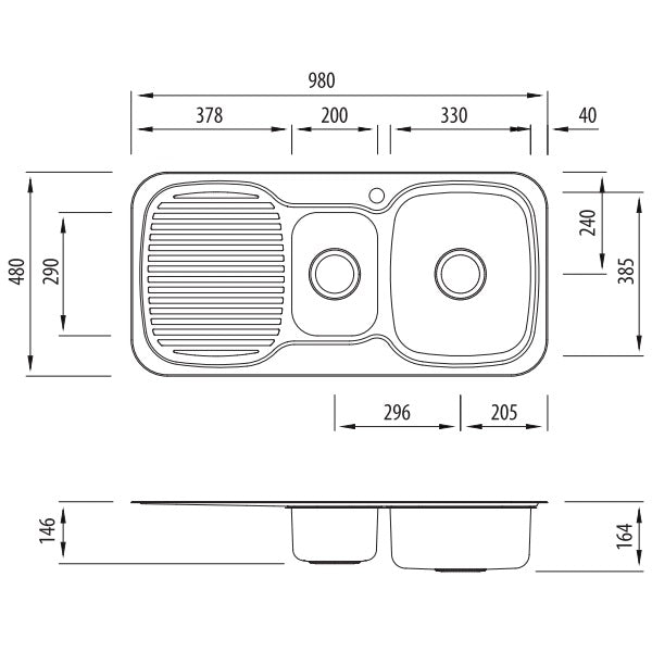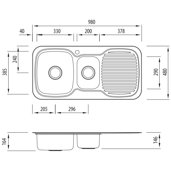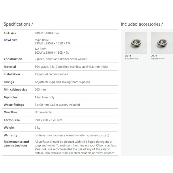Oliveri LakeLand 1 & 1/2 bowl topmount sink drainer 1TH