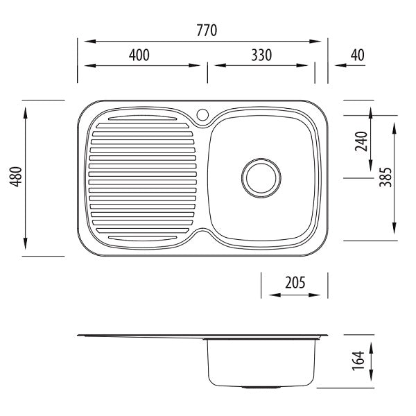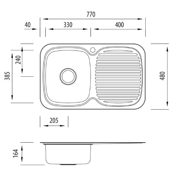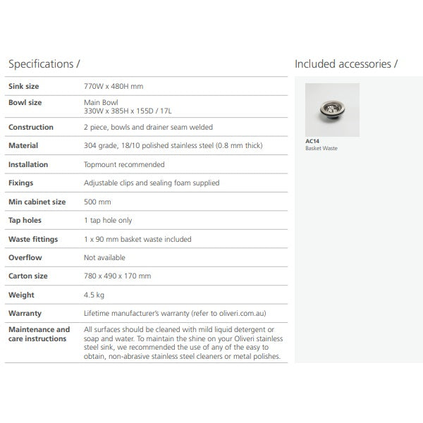 Oliveri Lakeland single bowl topmount sink drainer 1TH