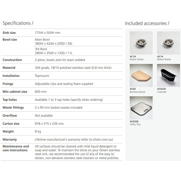 Oliveri Nu-Petite 1 & 3/4 R/H bowl topmount sink 1TH - The Blue Space