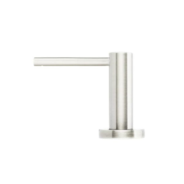 - A stylish round brushed nickel soap dispenser is the practical addition to any kitchen or bathroom