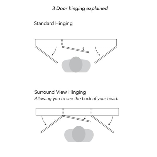 - 3-Door models are available in Standard Hinging or Surround View Hinging options. Surround View Hinging enables you to manoeuvre mirrors to allow you to see around to the back of your head.