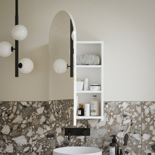 - Versatile arched shaving cabinet suits a wide array of design styles