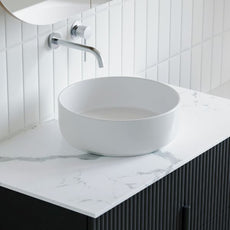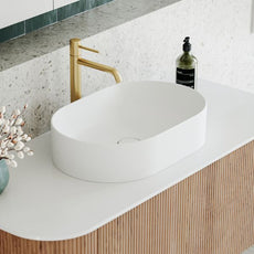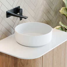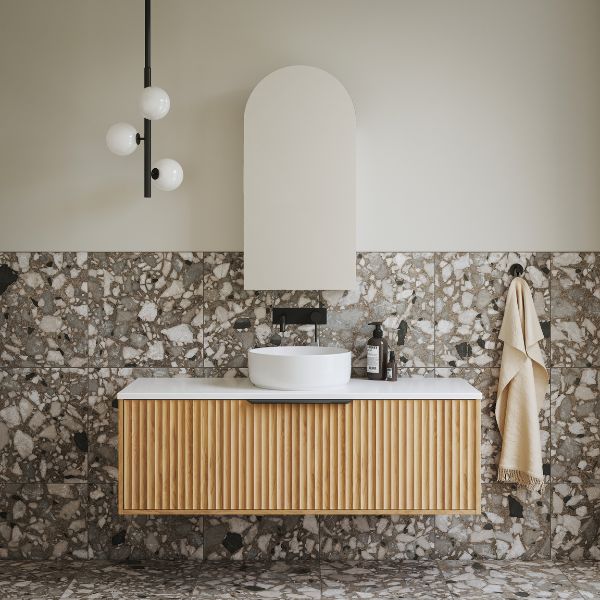 Vanity: Timberline Elwood Apollo in Prime Oak with Ova Black handles and Arctic White solid surface benchtop