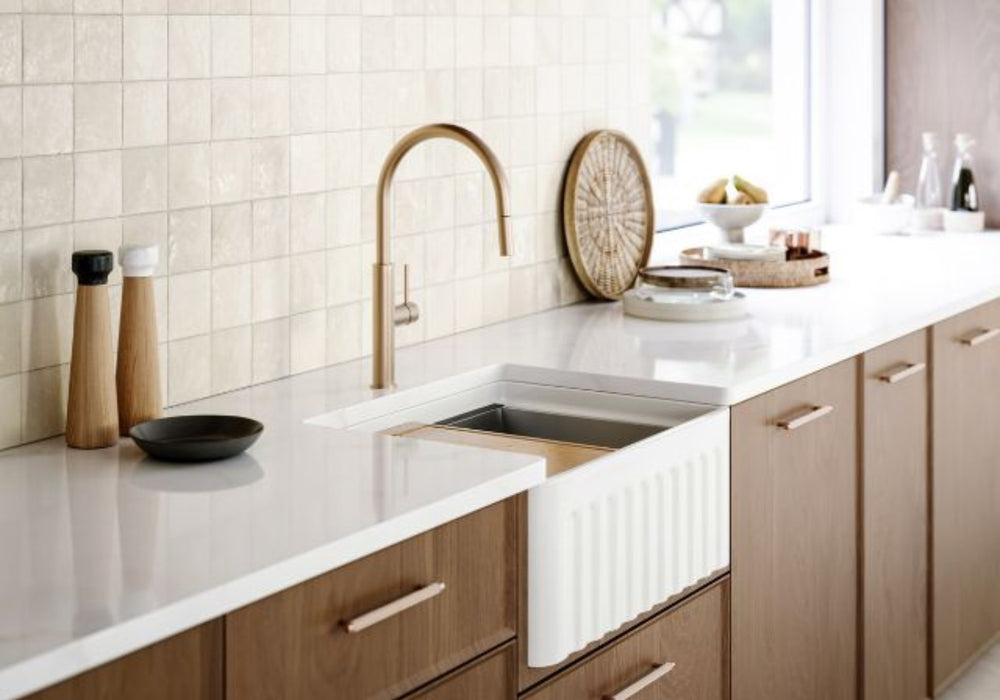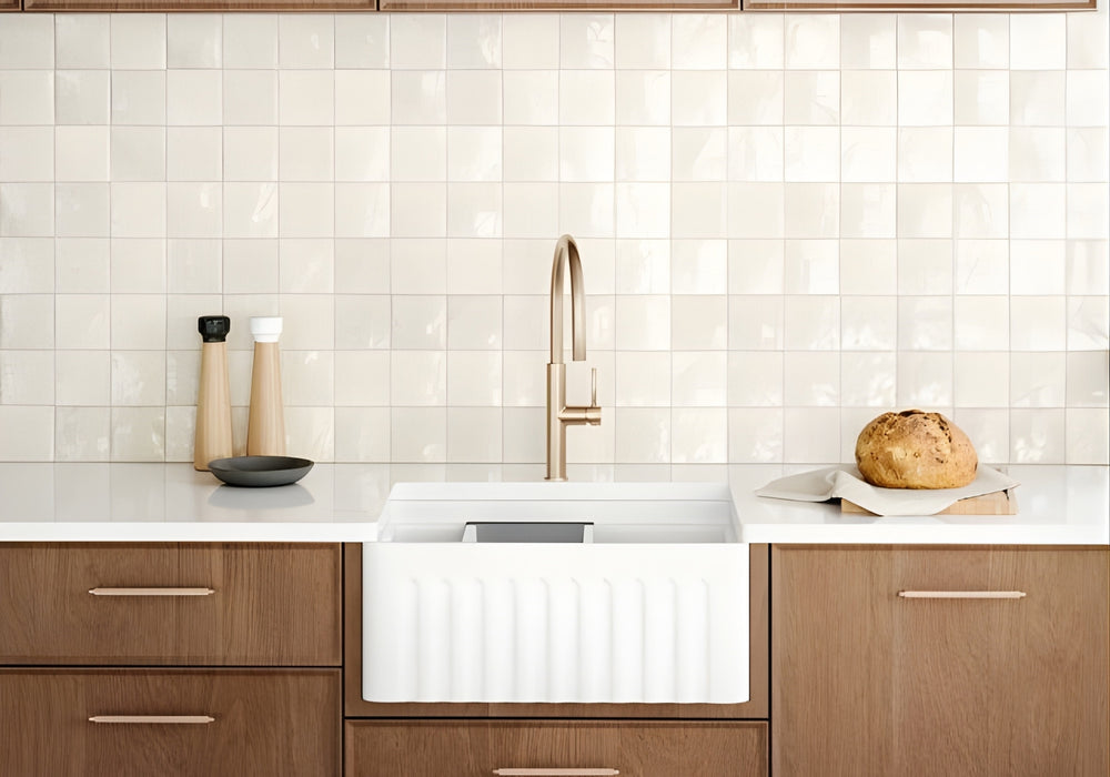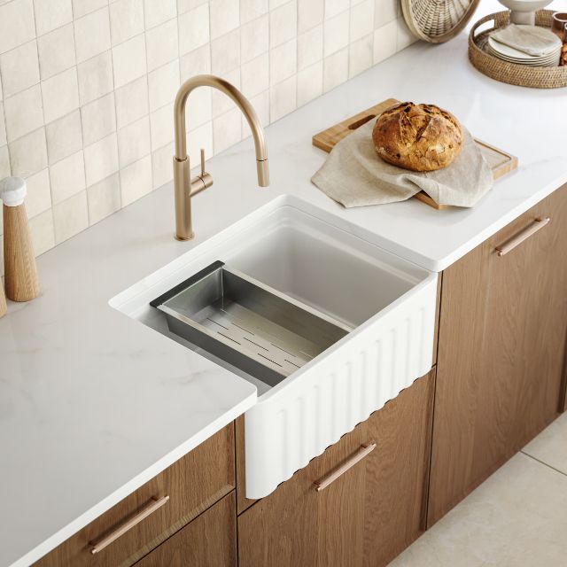 Revamp your kitchen with the Bao Ceramic Farmhouse Sink & Accessories Pack! Perfect for modern farmhouse, coastal, and shabby chic interior design styles, this glossy white, fluted ceramic butlers sink adds charm and functionality to your cooking space.