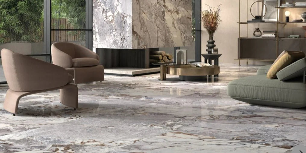 Our Grey Sofia Honed Marble Porcelain Tile 1200x600x6mm has the classic elegance of marble, featuring 20 unique and diverse faces in a 600x1200 6.5mm tile, creating a look that stands out by enhancing seemingly common reference models with unprecedented and highly innovative shades and graphics. This restyled classicism combines traditional backgrounds with fascinating and surprising blasts of surface colour to create unusual, and high impact effects.