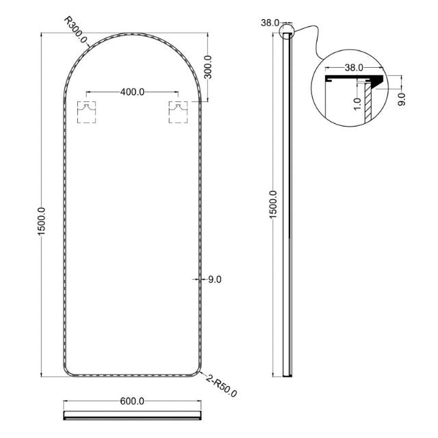 Ingrain Arch Shaped Full Length Mirror 1500mm by 600mm - Matte Black