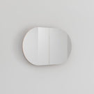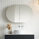 - Gorgeously versatile oval shaped cabinet with mirror doors