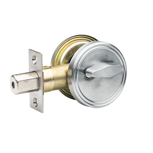 Single Cylinder Deadbolts are locked and unlocked with a key from the outside but does not require a key for locking and unlocking from the inside, which instead is unlocked with a thumb-turn style lever from the interior.