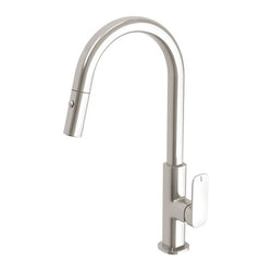 The Dolce Pull Out Sink Mixer with Vegie Spray is a contemporary kitchen accessory with a sleek, modern design. The sink mixer has a brass spout and faucet in brushed nickel finish with spot-resistant and easy to clean. This collection will add a trendy touch to any kitchen, or laundry space with its strong edges and streamlined design.