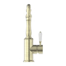 This Nero York Kitchen Mixer features an elegant aged brass finish and a unique hook spout design for added convenience and functionality. The white porcelain lever adds a touch of sophistication to your kitchen. Upgrade your space with this stylish and high-quality kitchen mixer.