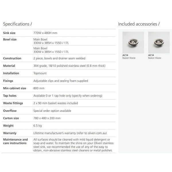 Oliveri Endeavour double bowl topmount sink NTH - The Blue Space