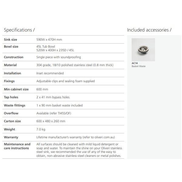 Oliveri Laundry 45L tub topmount with rinse bypass 2TH