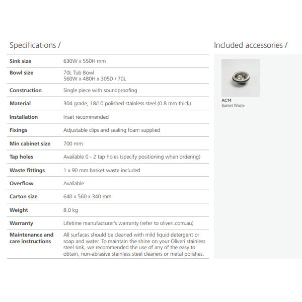 Oliveri Laundry 70L tub topmount L/H 1TH - The Blue Space