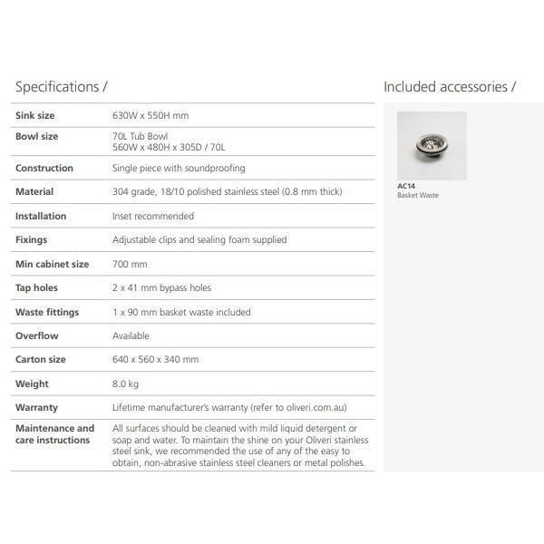 Oliveri Laundry 70L tub with rinse bypass 2TH