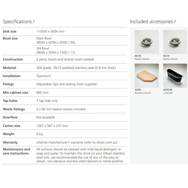 Oliveri Nu-Petite 1 & 3/4 bowl topmount sink drainer 1TH