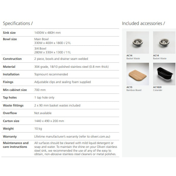 The Oliveri Petite is one of the many ranges of stainless steel sinks that are produced out of their factory in Adelaide.This model is complete with integrated colander and bamboo preparation board which fit comfortably within the main bowl.