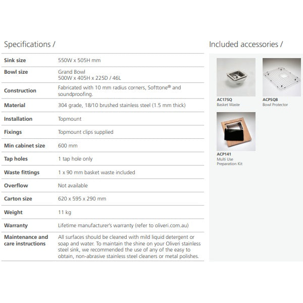 The Professional Series Single Grand Bowl Topmount Sink provides a large bowl, perfect for washing wide plates and platters. This model is complete with a multi use preparation kit and bowl protector to preserve the sink’s shine.What's In The Box