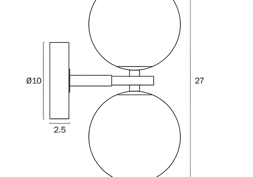 - The wall light has a total height of 27 cm and a width of 17 cm. The base has a diameter of 10 cm and a depth of 2.5 cm. It features two spherical diffusers, each with a diameter of 12 cm.